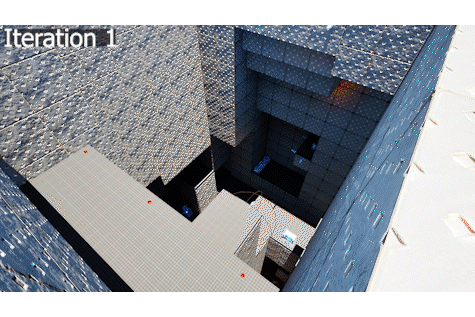 The final level of the vertical slice went through four major iterations, but the most noteworthy was the change from the first one. In order to test out the new approach to TGiAR's level design I made a 'playground disguised as a level' where the player had a many large spaces that they could navigate through with the semblance of a goal. Once the team knew that is the direction we wanted to head, I began work on iteration 2