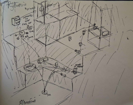 The process of making TGiAR starts with a sketch of the room to get an idea for its identity. Then a block out of the room that is easy to change and move around. Once the block out is complete I put the artist walls and floors into the level, and (often retroactively) place basic shapes where the art might go. I would hand the room over to the artist, answer any questions they might have, almost like magic the room was lit and art assets appeared.